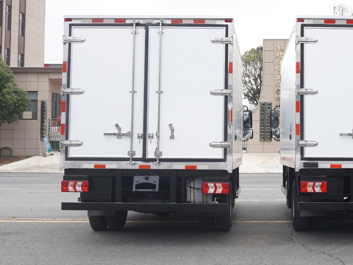 (2)廂板材質(zhì):內(nèi)外壁板選用國(guó)內(nèi)優(yōu)質(zhì)玻璃鋼(不吸光、隔熱性好、硬度強(qiáng)、抗氧化);中間保溫層為XPS擠塑聚笨板或聚氨酯;廂體厚度8CM。地板采用鋁花紋板,門(mén)邊條采用迷宮式橡膠密封條。