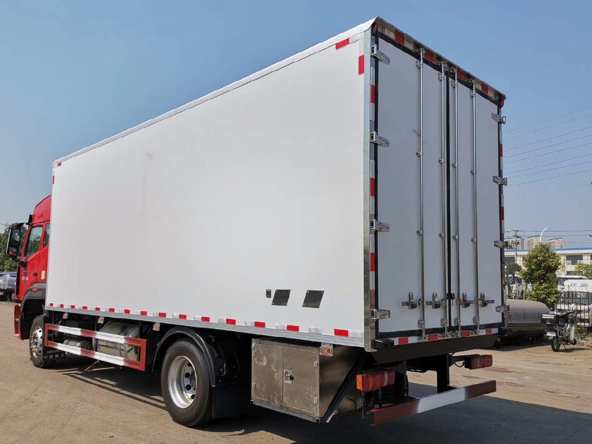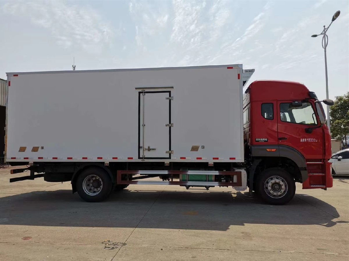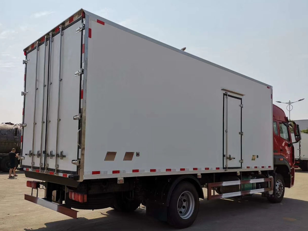 (2)廂板材質(zhì):內(nèi)外壁板選用國內(nèi)優(yōu)質(zhì)玻璃鋼(不吸光、隔熱性好、硬度強(qiáng)、抗氧化);中間保溫層為XPS擠塑聚笨板;廂體厚度8CM。地板采用鋁花紋板,門邊條采用迷宮式橡膠密封條。
