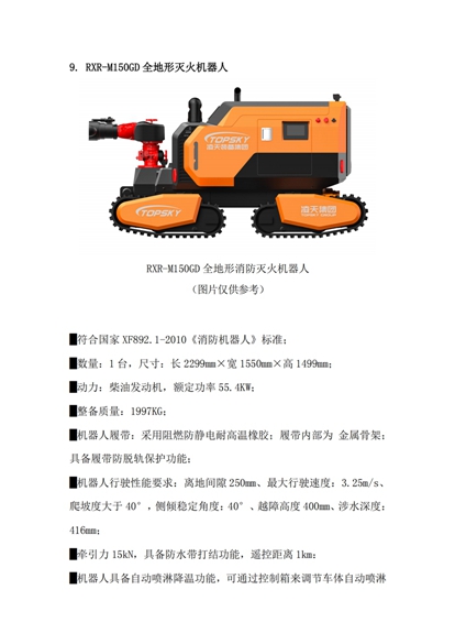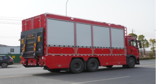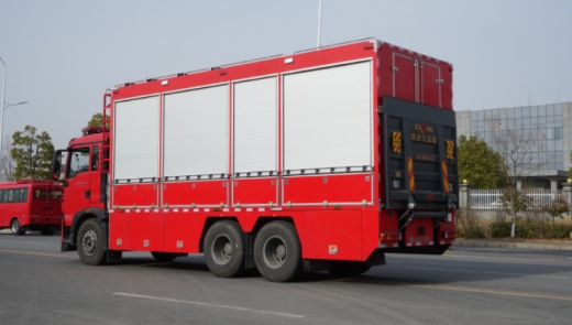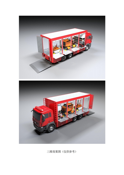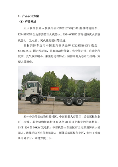 該模塊車由、重汽豪沃器材消防車、全地形消防滅火機器人、防爆消防滅火偵察機器人、發(fā)電機、滅火輔助器材等組成。